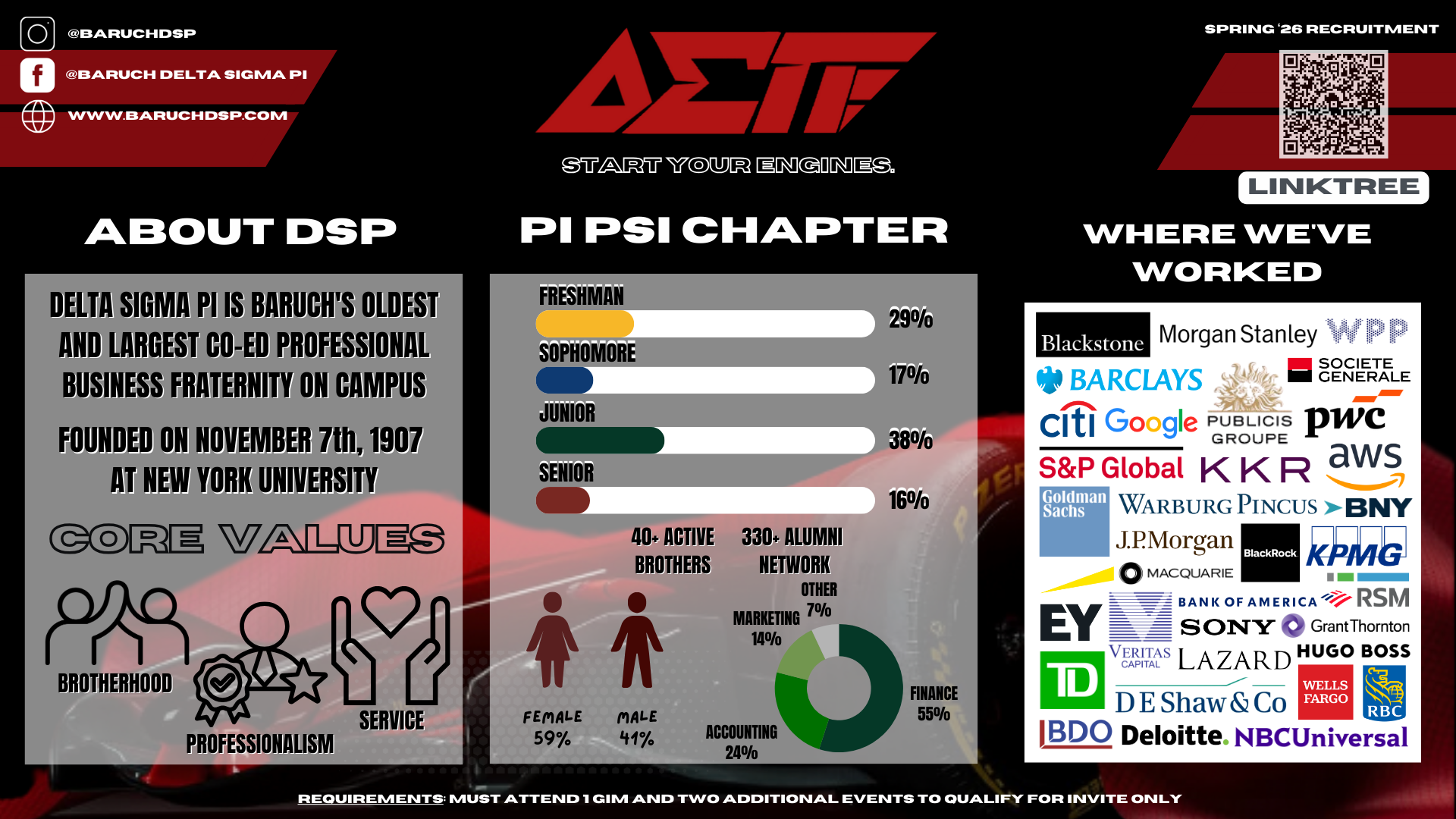 Thank you for your interest in Baruch Delta Sigma Pi and on behalf of everyone, welcome! The focus at the start of each semester is recruiting, which enables students to grasp a better understanding of this organization, meet as many members as possible to get a better sense of the community, and learn about our principles of Brotherhood, Professionalism, and Service.